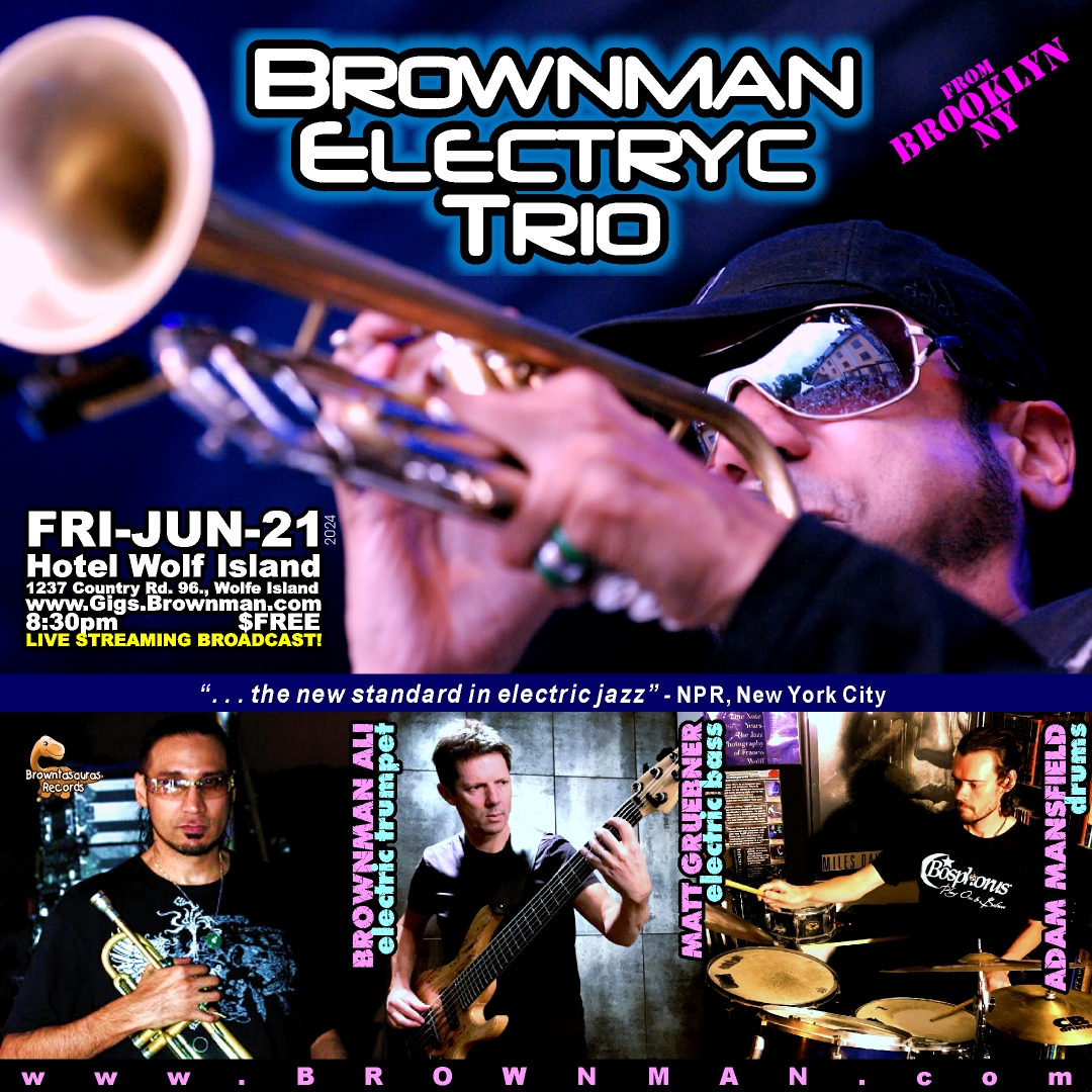BROWNMAN ELECTRYC TRIO is led by internationally acclaimed Brooklyn, NY based jazz iconoclast Brownman Ali — a protege of trumpet legend Randy Brecker — is the current touring trumpet player for hip-hop icons Jay-Z, Kanye West, and Missy Elliot, who was just nominated for a 2024 JUNO award for “Jazz Album of the Year”, after already winning Canada’s Black IMPACT Award (the first jazz musician in history to win this), and has been called “Canada’s preeminent jazz trumpet player” by the New York Village Voice, “the new standard in electric jazz” by NPR, New York (National Public Radio), and “one of the most exploratory voices in jazz trumpet today” by the Chicago Tribune. Brownman is also the CEO of Browntasauras Records in Brooklyn, NY, home to the 8 groups he leads and artists he has mentored and produced, where the label’s mandate is to “catalyze the creation of new jazz art”, and where 100% of all proceeds go directly back to the Artists on the label.